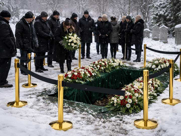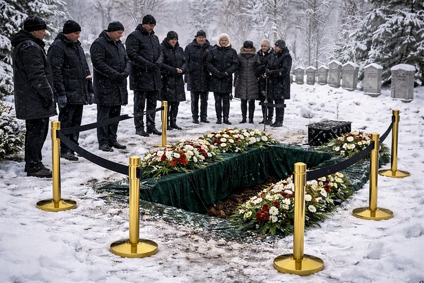Pogrzeb na cmentarzu przy umiarkowanym opadzie śniegu