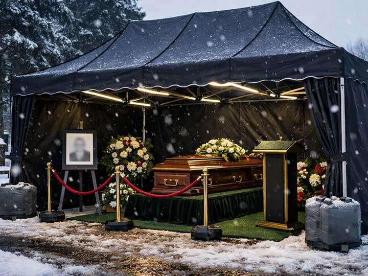 Namioty pogrzebowe są niezbędnym elementem na każdym pogrzebie organizowanym na cmentarzu w trakcie opadów śniegu lub deszczu. Chronią uczestników przed warunkami atmosferycznymi i stwarzają przestrzeń, w której ceremonia może przebiegać w sposób godny, nawet gdy na zewnątrz jest bardzo zimno. Prima-Tech oferuje namioty pogrzebowe w różnych rozmiarach – od modelu 3x3 m po 3x4,5 m – w wariantach pro i premium pro, które są przystosowane do trudnych warunków zimowych.