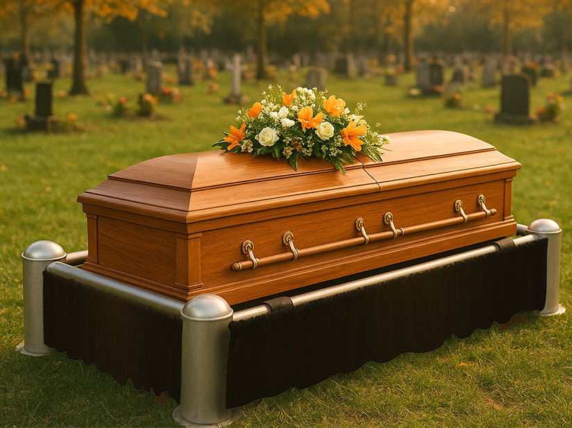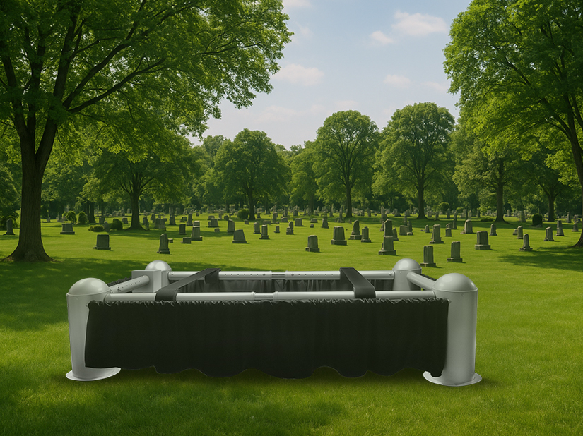 To nowoczesne urządzenie umożliwia płynne, precyzyjne i bezgłośne opuszczanie trumny do grobu, dzięki czemu cały przebieg ceremonii odbywa się w sposób elegancki i w pełni kontrolowany.