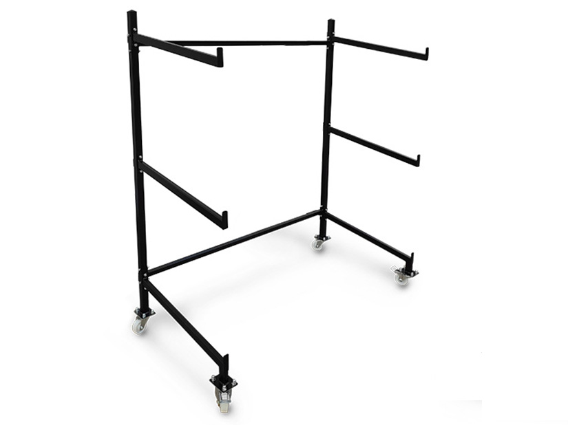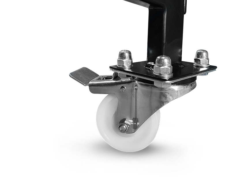 Dzięki czterem obrotowym kółkom z hamulcem regał można bez trudu przestawiać w dowolne miejsce. Po zablokowaniu kół konstrukcja pozostaje całkowicie stabilna, co gwarantuje bezpieczeństwo podczas przechowywania lub prezentacji trumien.